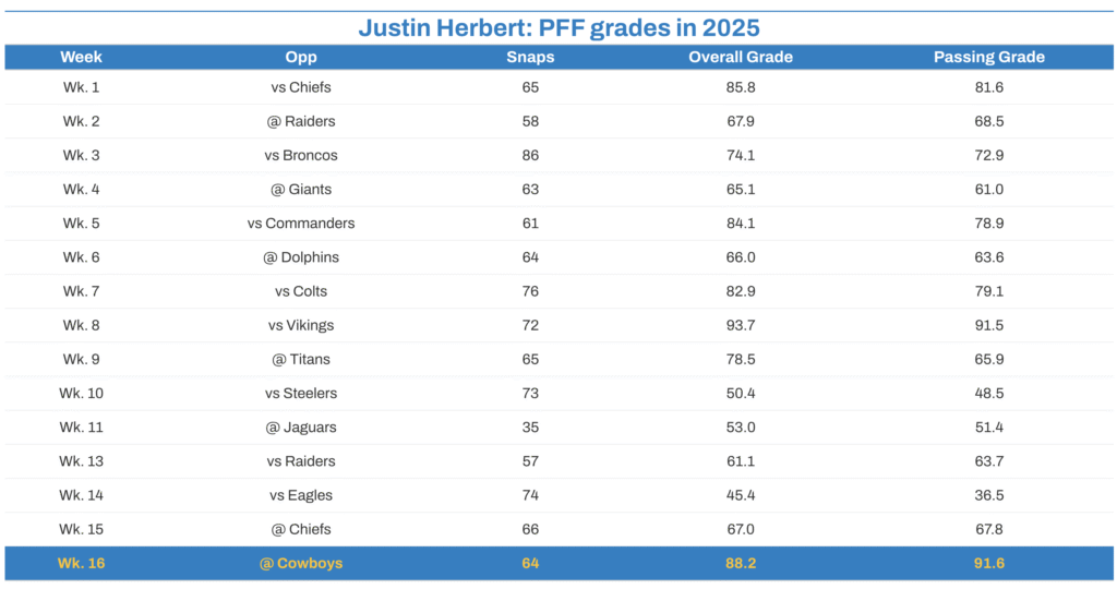 - Justin Herbert stands out in Week 16: The veteran quarterback earned an 88.1 PFF overall grade, his second-highest single-game grade of the season and the third-highest grade among all quarterbacks in Week 16.