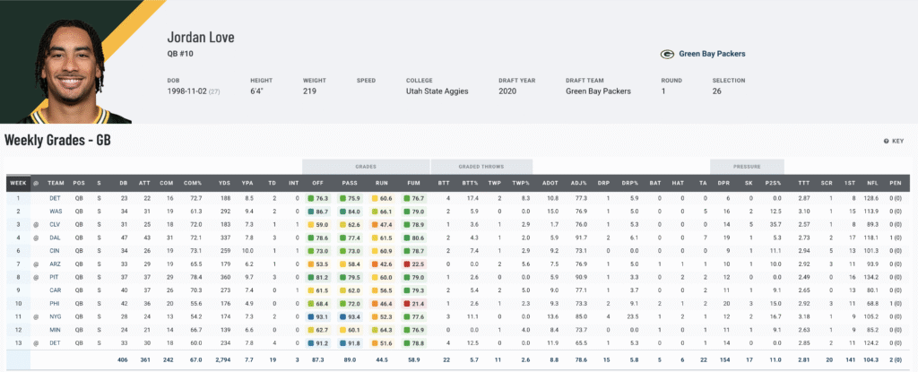 The former first-round pick earned a 91.2 PFF overall grade, the highest among quarterbacks in Week 13. Love is now PFF’s third-highest-graded quarterback on the season after posting two games in the past three weeks with a PFF overall grade above 90.0.