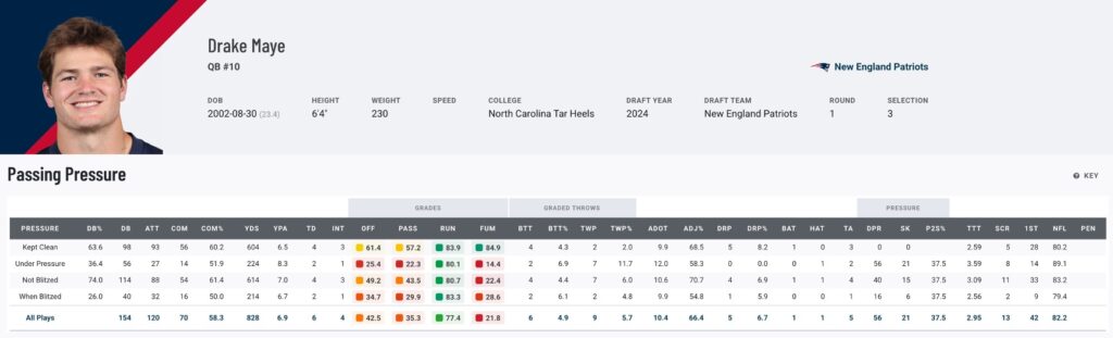 Drake Maye: Performance under pressure in the regular season vs. in the playoffs