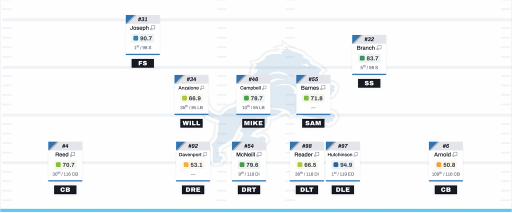The top three players in this unit are very strong, but depth remains a major question mark. Safety Julian Love has improved his PFF grade in five consecutive seasons, earning an 82.2 in 2024. Cornerbacks Devon Witherspoon and Tariq Woolen excel at preventing separation and limiting big plays. Safety Coby Bryant may have found his groove after posting a 72.8 grade in 2024, up from 34.0 the previous year, but it will be a wait-and-see approach with him and rookie Nick Emmanwori.