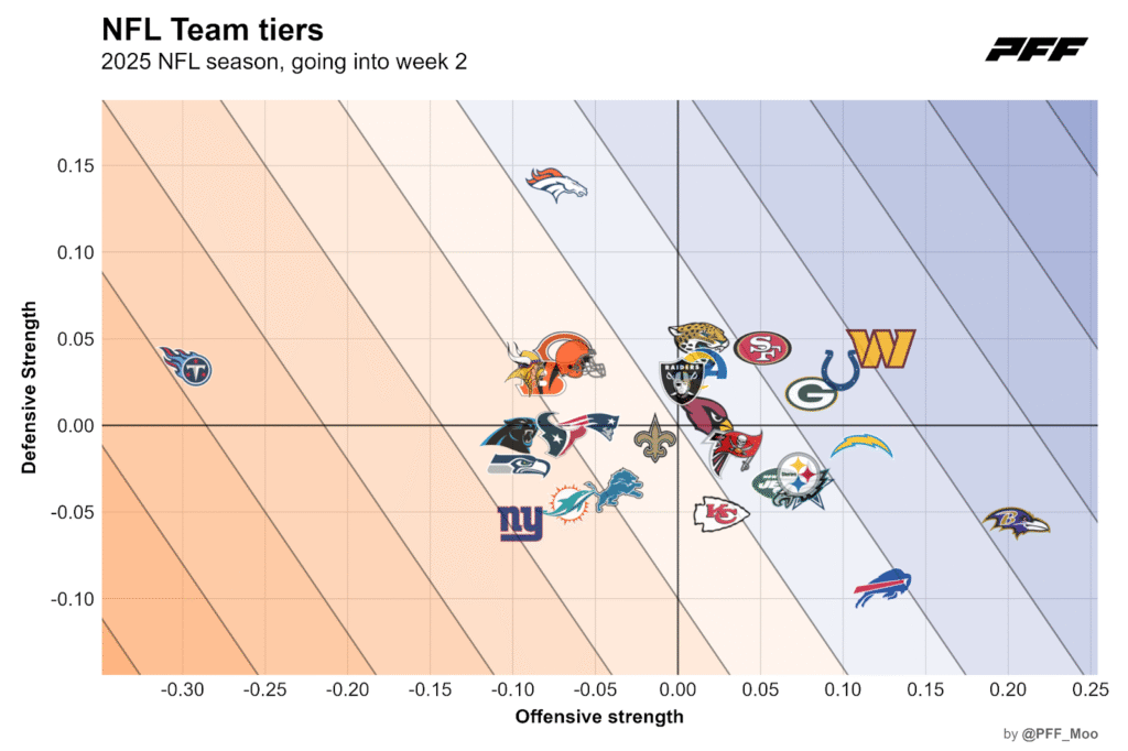 The following chart groups teams by expected points added per play. To improve predictive power, high-leverage plays such as turnovers and goal-line plays are down-weighted a bit. Additionally, the team strengths account for opponents faced and recent performances count more toward the estimated team strength than performances earlier in the season (which does not matter right now after only one game).