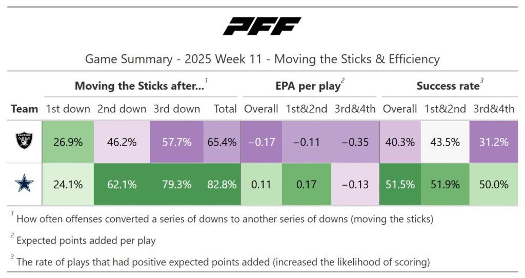 According to the PFF noise-canceled score metric, the Cowboys dominated throughout the game as the Raiders continued to struggle on both offense and defense.