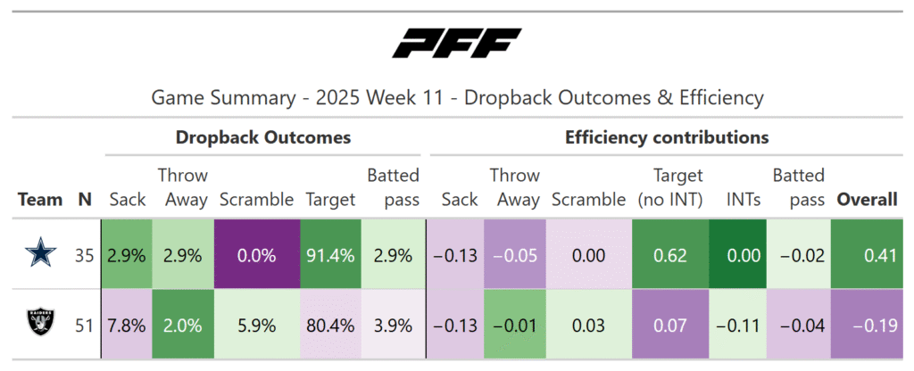 Ashton Jeanty finished the game with seven yards on six carries. That’s all you need to know about the Raiders' running game. The Cowboys, however, were decent when running the ball, sporting a 50% success rate in the open field before stalling in the red zone (where they could rely on the passing game).