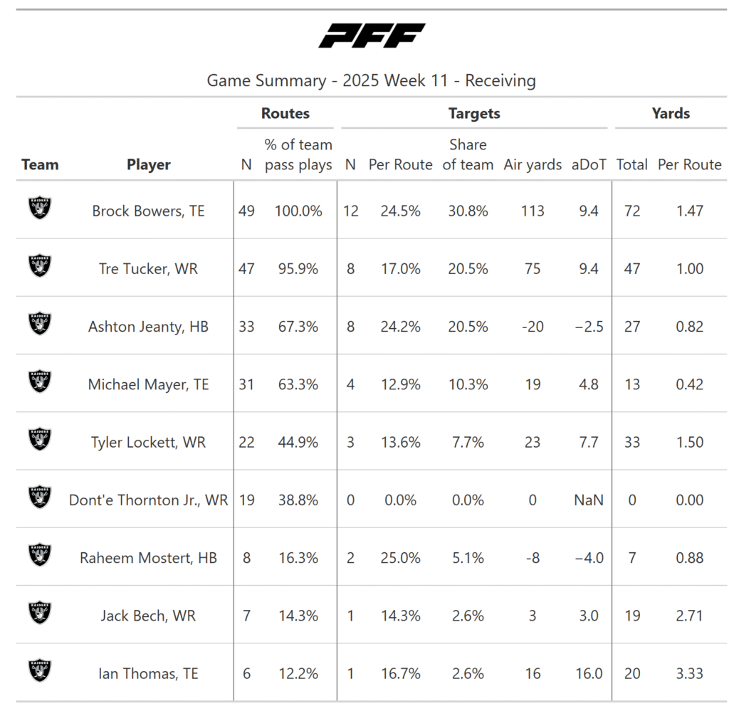 - The Raiders are in a rut: Losers of four straight, Las Vegas again failed to generate consistent success this week. Running back Ashton Jeanty has been held in check, forcing Geno Smith to play hero.