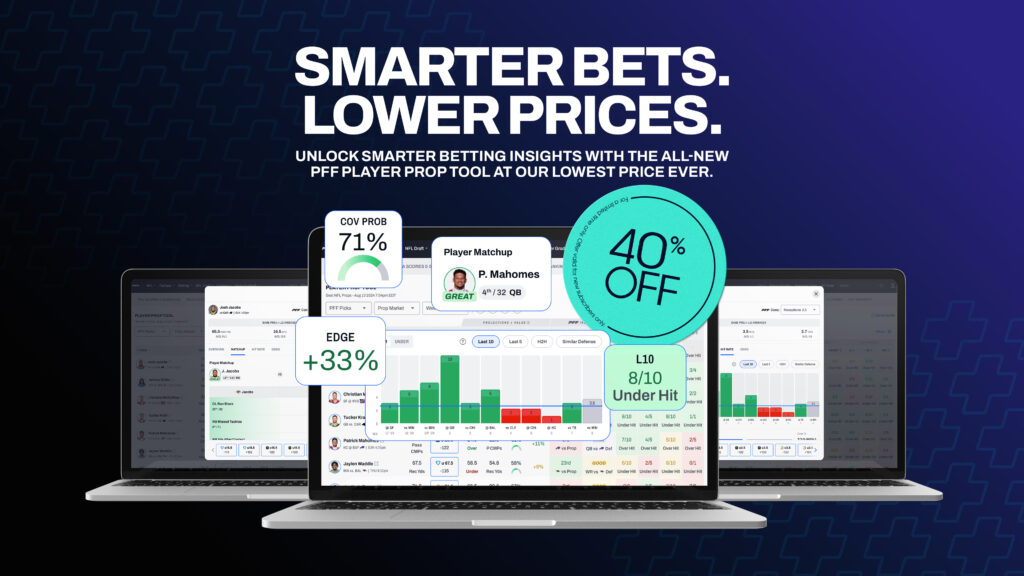 - Get PFF+ for 40% off: Use promo code BLACKFRIDAY to unlock the PFF Player Prop Tool, Premium Stats, fantasy dashboards, the PFF Mock Draft Simulator, industry-leading fantasy rankings and much more — everything you need to win your season.