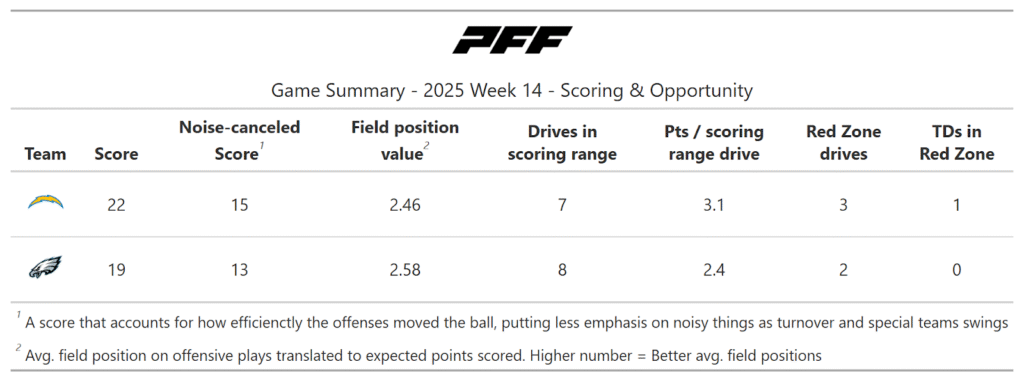 According to the PFF noise-canceled score metric, the game produced even fewer points than the already modest final score, with both teams struggling to move the ball.