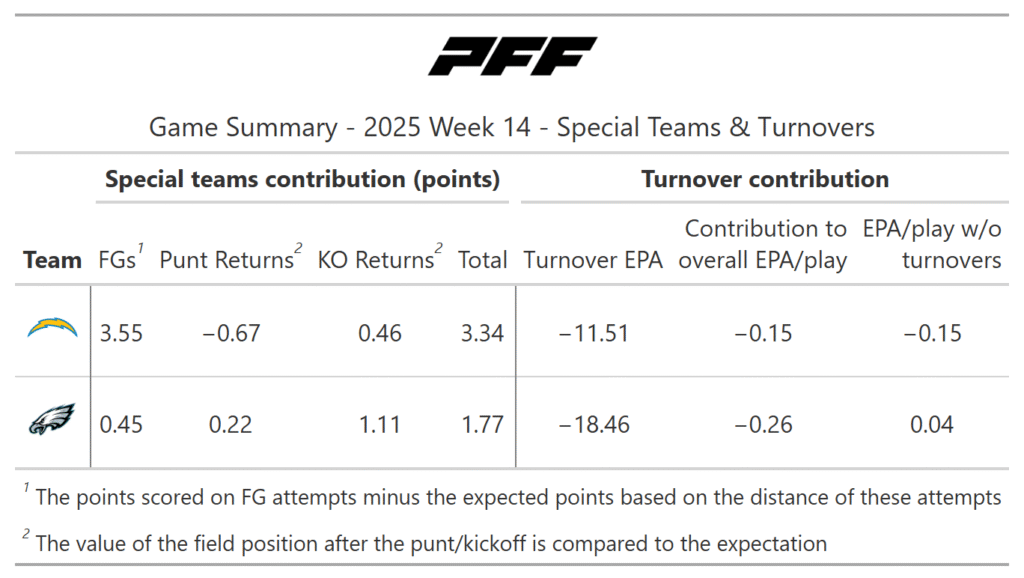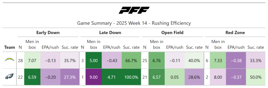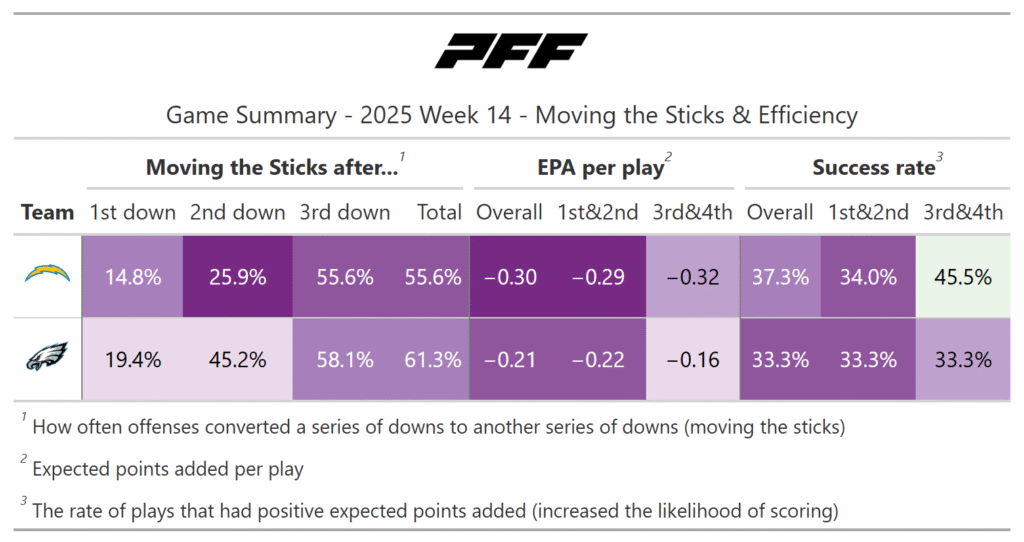 Neither team fielded an efficient passing offense — but for very different reasons. The Eagles threw four interceptions, completely tanking their otherwise average performance. The Chargers simply couldn’t get much going due to failing to protect quarterback Justin Herbert, a frequent occurrence this season.