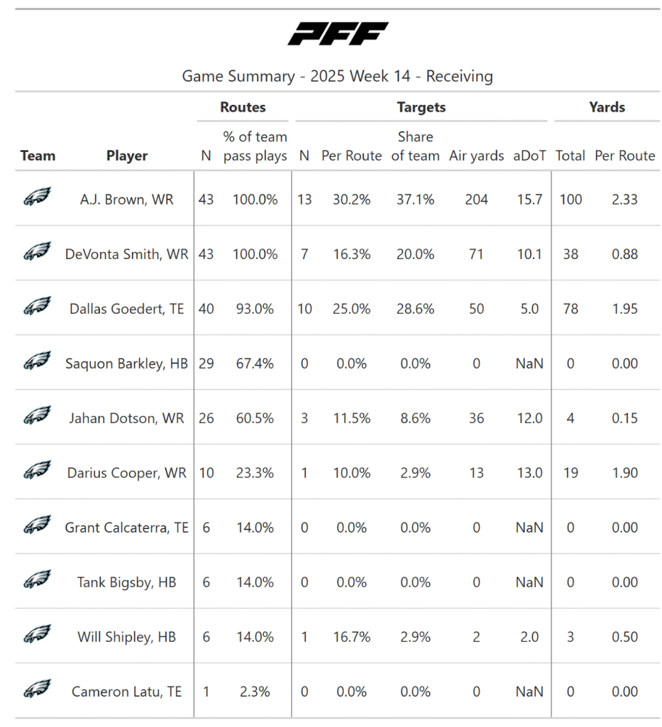 Although A.J. Brown is getting more opportunities and producing, the Eagles were at least winning when he was having quiet weeks. He racked up a whopping 204 air yards on 13 targets and finished with 100 true receiving yards, making him, by far, the most productive Eagles receiver.