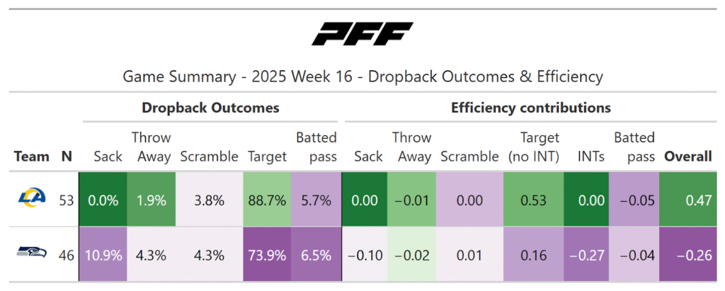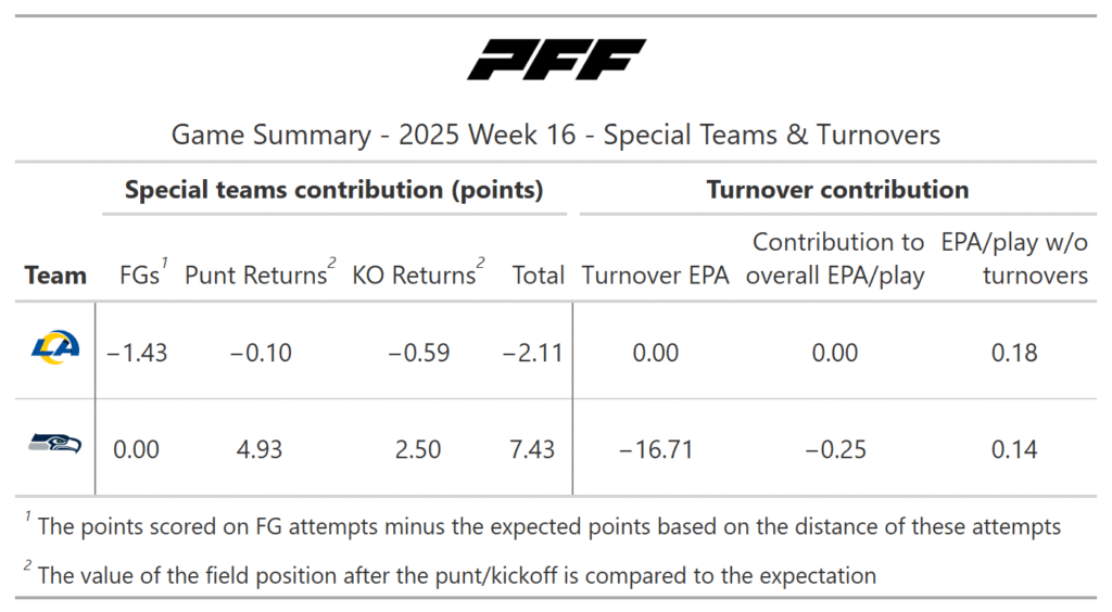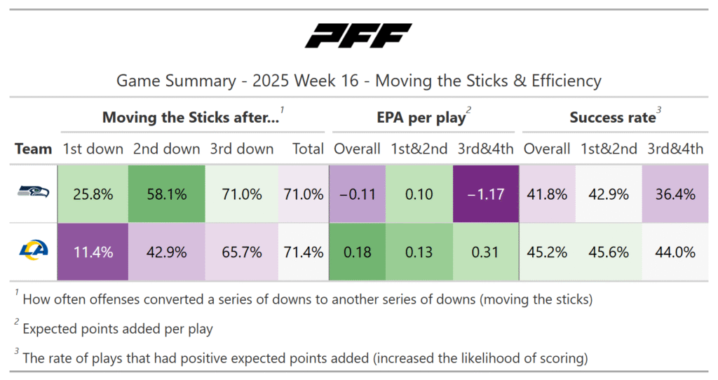 According to the PFF noise-canceled score metric, the Rams should’ve won the game, as they were more consistent, but they gave up a punt-return touchdown and three two-point conversions. It’s also notable that all three of the Seahawks' offensive touchdowns came after single big plays instead of sustained drives. Nevertheless, the Rams still had plenty of chances to finish the game in the fourth quarter.