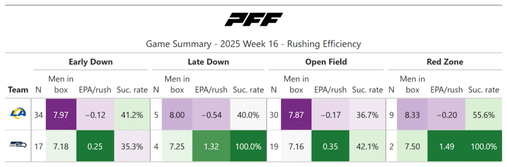 The Rams started the game well on the ground, but the Seahawks‘ defense got better throughout the game and ultimately held Los Angeles to one of its worst rushing performances of the season. The Seahawks weren’t consistent on the ground but had a few important big plays.