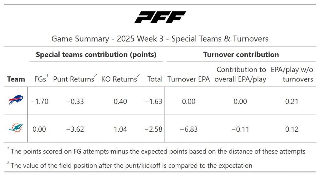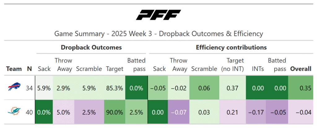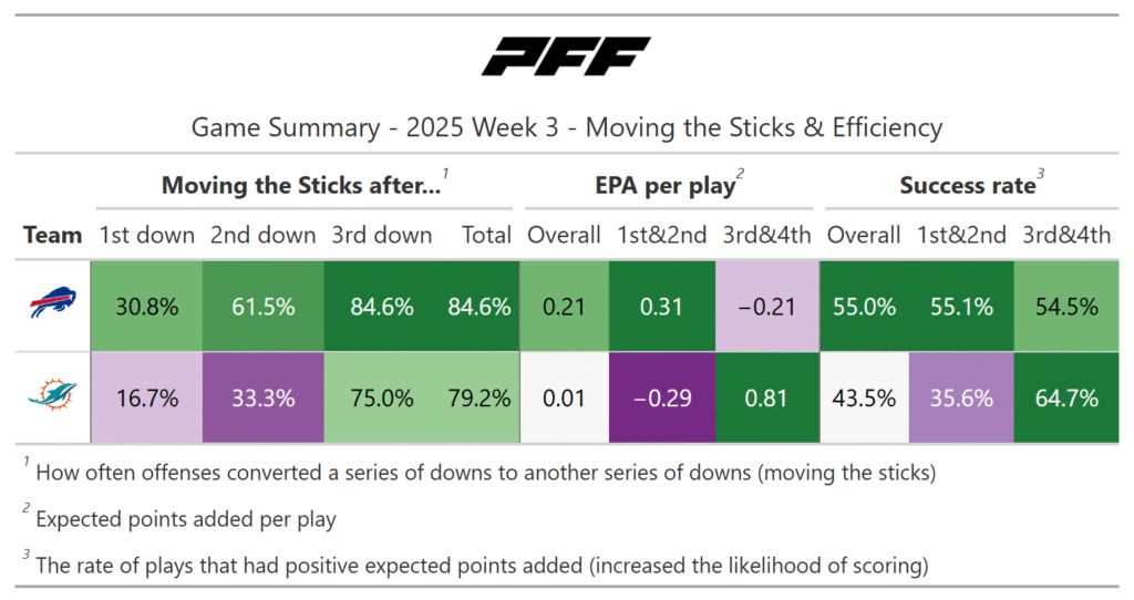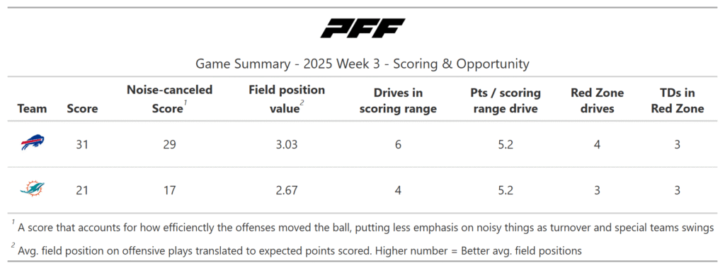 According to the PFF noise-canceled score metric, the Bills deservedly won the game. They moved the ball much better, especially on early downs. The Dolphins were more efficient once reaching the red zone, but they didn’t get to that point as often as Buffalo.