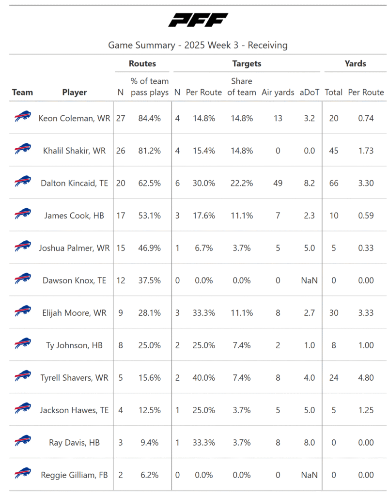 It was an off-game for Keon Coleman, who was targeted for only 13 air yards. Khalil Shakir was mostly used in the screen and quick-passing games, and he made the most out of it with 45 yards after the catch. Dalton Kincaid moonlighted as the Bills' No. 1 receiver, recording the most targets, air yards and receiving yards.