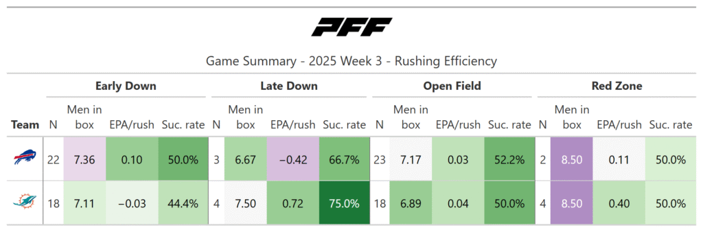 - Both running games proved efficient: The Bills excelled on early downs, whereas the Dolphins were particularly effective on third downs and in the red zone.