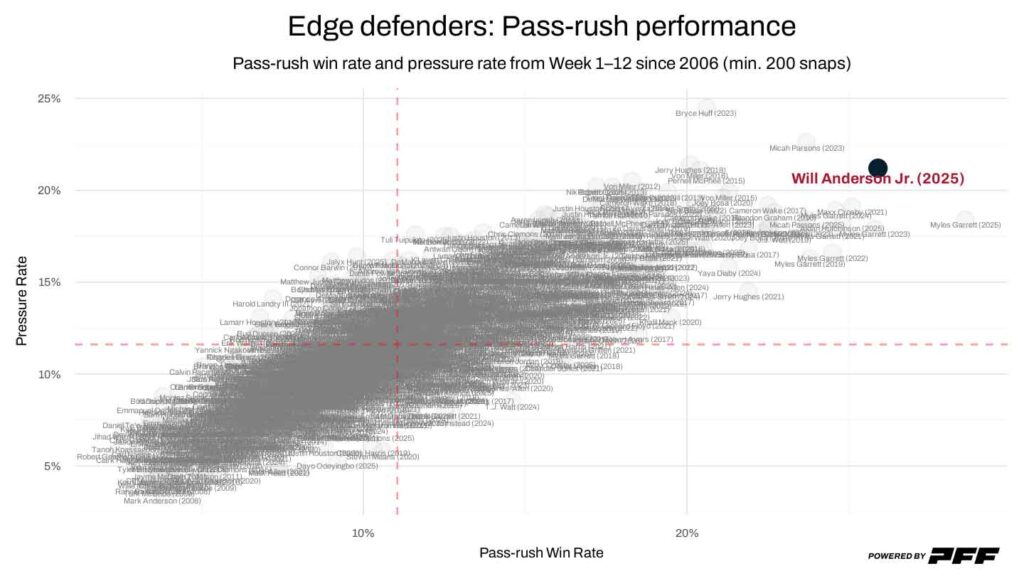 We could spend all day digging into the statistical season Will Anderson Jr. is putting together. His 11 sacks may fall well short of Myles Garrett’s league-leading 19, but Anderson has actually generated 10 more total pressures than Garrett and owns a 21.2% pressure rate — the best mark of any defensive lineman this season.