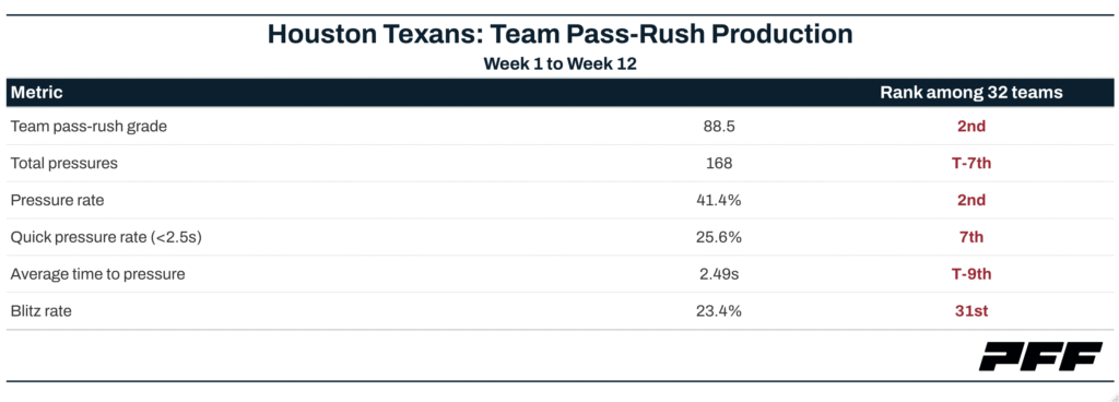 Houston’s stunt rate sits well below the league average, and the Texans haven’t dialed up a single simulated pressure all season. Every other defense in the NFL has used at least 10. Despite that, Houston continues to generate quick pressure with remarkable consistency — a testament to the talent on the defensive line rather than any schematic sleight of hand.
