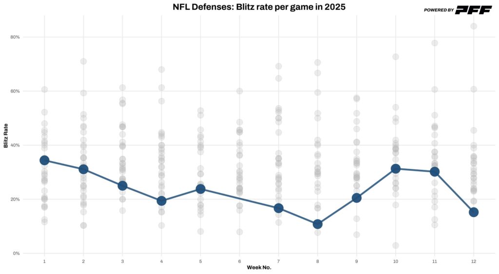 That advantage was on full display in Houston’s Week 12 dismantling of the Bills offense. Seven of the Texans’ eight sacks on Josh Allen came from standard four-man rushes, and they blitzed him on only 15% of his dropbacks — a massive shift just four days after Tampa Bay sent extra pressure on 58% of Allen’s attempts.