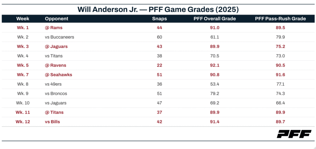 - One of the best defenses in the NFL: At the center of DeMeco Ryans’ charged-up unit is third-year edge defender Will Anderson Jr., who has already earned six PFF grades of 89.0 or higher through his first 11 outings.