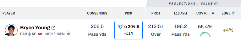 QB Bryce Young, Carolina Panthers: Over 205.5 passing yards (-114)