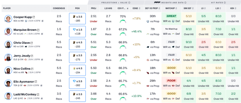 Keenan Allen ran 30 routes last week against the Eagles — his highest total since Week 7 — as Los Angeles leaned less on heavy personnel with Tucker Fisk sidelined. That usage should carry over against Kansas City, especially with the Chargers entering as underdogs. Allen has cleared four receptions in nine of his last 10 games against comparable defenses based on PFF’s clustering data and caught seven passes against the Chiefs in Week 1.