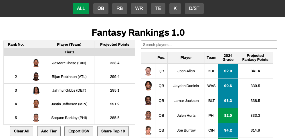 The Rankings Builder features a responsive table designed to help you find exactly what you need — fast. Use the search bar to pull up any player instantly, or filter down the table by team, 2024 PFF grade or a range of position-specific projections.