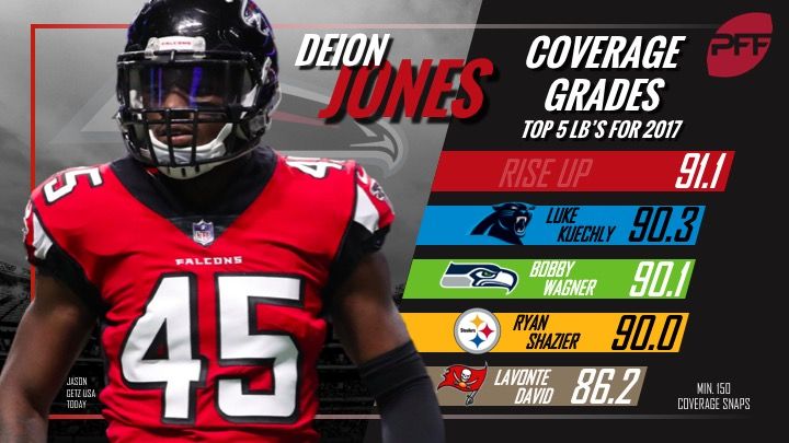 Per ESPN's Adam Schefter, Atlanta has signed four-year veteran linebacker Deion Jones a four-year, $57 million extension, including $34 million guaranteed. In his three years in the NFL, Jones has earned a 90.5 coverage grade across his 1,460 coverage snaps, ranking fourth among the 75 off-ball linebackers with at least 1,000 defensive snaps since 2016. His overall grade (82.6) also ranks seventh among the same group of off-ball linebackers.