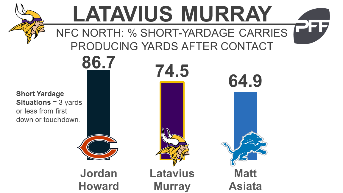 - In short-yardage situations Murray has shown an above average ability to get extra yards and in 2016 he ranked 12th in the NFL in percentage of short-yardage carries that generated yards after contact at 74.5%. (Short Yardage Situations = three yards or less from first down or touchdown)