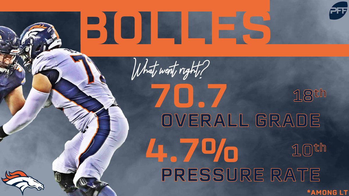 In fact, if Bolles had committed just one or two offensive holding penalties, his grade would have been much higher, as his pressure rate allowed (4.7%) last season ranked 10th among left tackles.