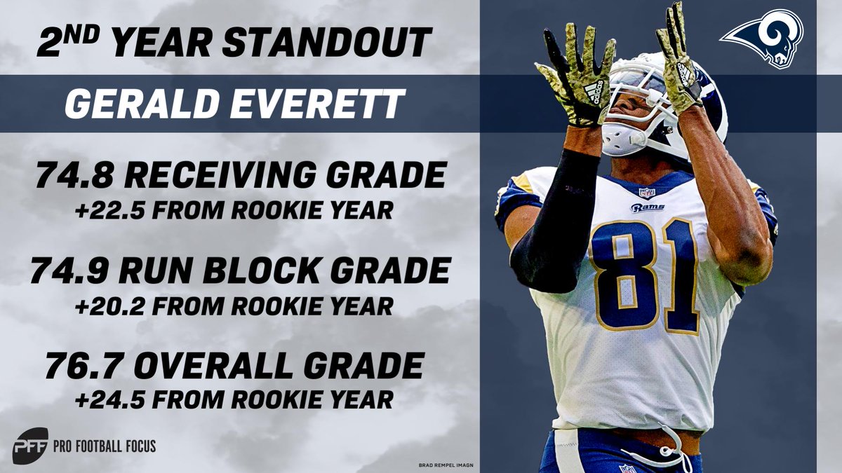 Everett finished the 2018 season as our fourth-highest graded tight end, exactly one season after he ranked 50th out of 51 qualified tight ends as a struggling rookie. The Rams' 2017 second-round pick caught 97.4% of the catchable passes thrown his way as an NFL sophomore after he hauled in just 70.8% of catchable passes as a rookie, and he showed tremendous improvement as a run blocker, as he ranked fourth in the league last season with a 76.3 run-blocking grade, a grade that was over 20.0 points higher than the 54.6 run-blocking grade he earned as a rookie.