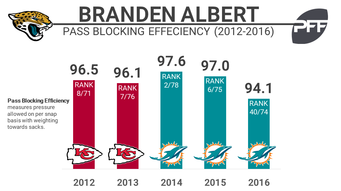 - Albert has been plagued by injuries since 2011, which was the last season he played a full 16-game slate. In 2016, those injuries seemingly caught up with Albert as his grade dipped to a career-low 49.0 overall, 64th among 76 qualifying offensive tackles.