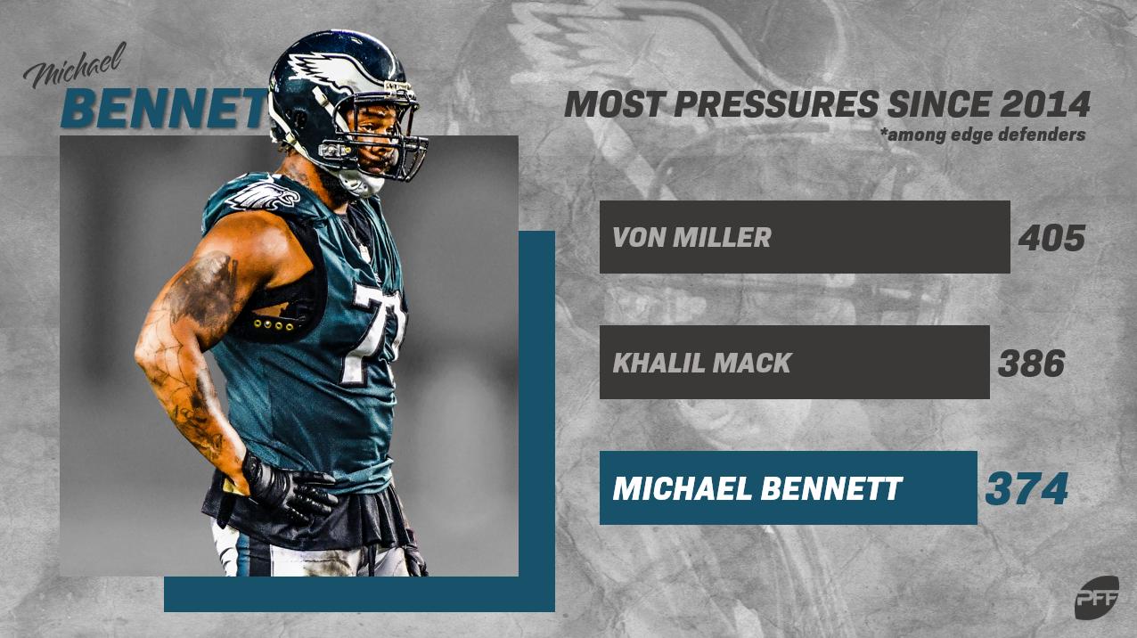 And this should come as no surprise. Bennett is one of only five players at the position who has tallied at least 40 pressures in each of the last seven seasons, and he has recorded at least two quarterback pressures in 117 of his 146 career games. Since 2014, only Khalil Mack and Von Miller have produced more quarterback pressures than Michael Bennett's 374.