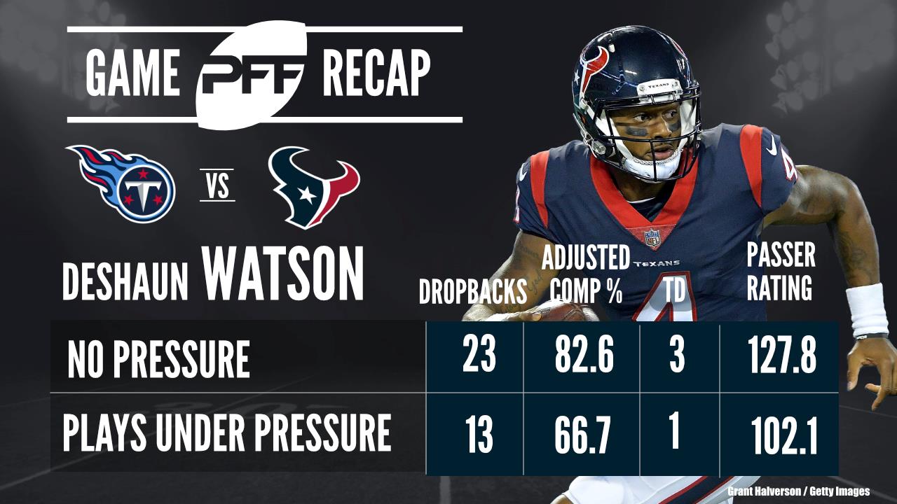 - Houston Texans rookie quarterback Deshaun Watson had a stellar performance Sunday against the Tennessee Titans. With five total touchdowns (tying the all-time single-game rookie QB record) Watson finished the game with an overall grade of 86.9, the second-highest of all quarterbacks so far in Week 4. His run grade of 87.8 is currently the second-highest among all quarterbacks through nearly four weeks of action.