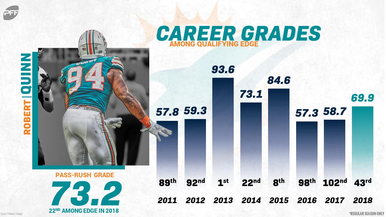 Enter Robert Quinn, who has had some great seasons throughout his time in the league, and even finished as the second-ranked player in the entire NFL in our top 101 back in 2014. He has had some down years, but Quinn’s ceiling is extremely high and he’s still only 29 years of age. He’s also coming off the fourth-best single-season overall grade (69.9) of his eight-year career.