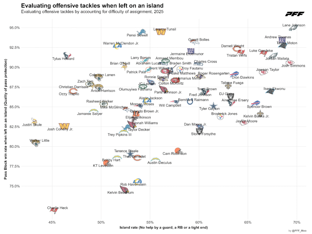 Because of their heavy use of condensed formations, neither Abraham Lucas nor Charles Cross has been asked to block on an island at a high rate, but when they have been, both have more than held their own and performed at an above-average level.