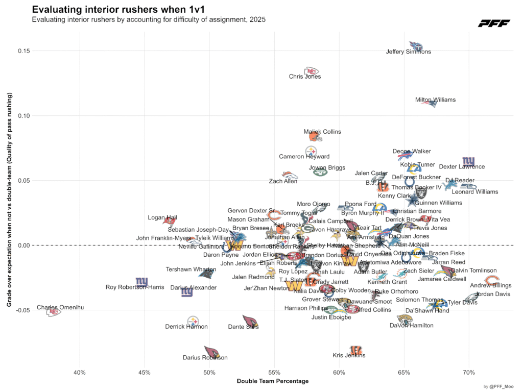 The interior is a different story. Jalen Sundell, Grey Zabel and Anthony Bradford aren’t poor linemen by any means, but they represent the weakest link in Seattle’s pass protection, as all three graded slightly below average as pass blockers. That’s where the Patriots will look to attack, particularly with Milton Williams, who has been excellent when deployed in sub-packages and given one-on-one rushing opportunities.