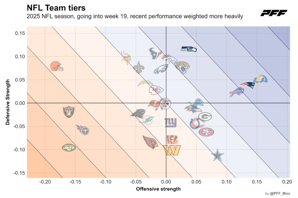 There is one glaring problem: the Patriots’ offense has been very poor in the playoffs. Over their last three games, they averaged just 4.4 yards per play and -0.17 EPA per play — production that would have ranked 29th during the regular season.