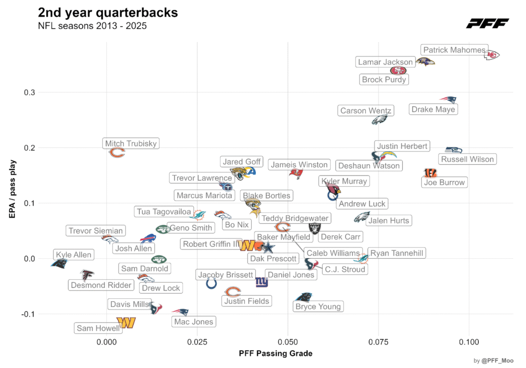 Over the past 12 years, arguably only Patrick Mahomes and Lamar Jackson — both eventual MVPs — have produced better sophomore seasons. Even then, they did so in a league environment that was far less focused on limiting explosive passing plays than today’s defenses.