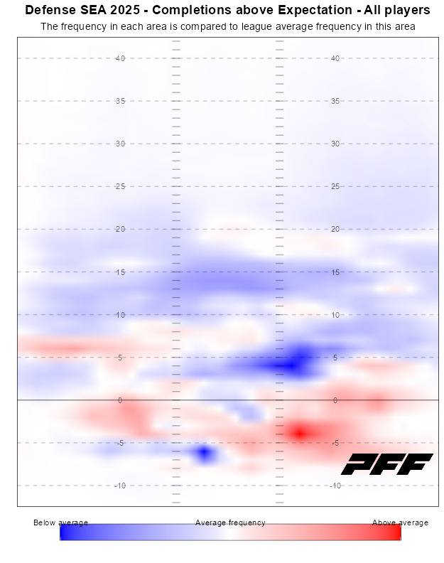 The heatmap below illustrates that reality. The Seahawks consistently funnel targets — and completions — to the short areas of the field, trusting their disciplined underneath coverage to rally, tackle and limit explosive gains.