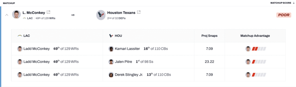 Los Angeles Chargers WR Ladd McConkey vs. Houston Texans DB Jalen Pitre