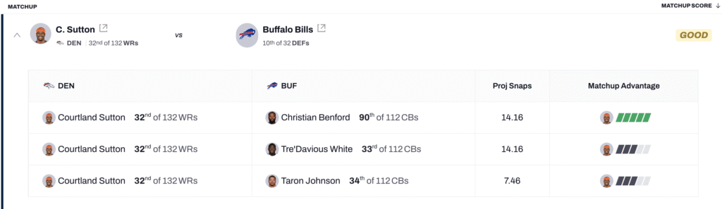 Denver Broncos WR Courtland Sutton vs. Buffalo Bills CB Tre’Davious White