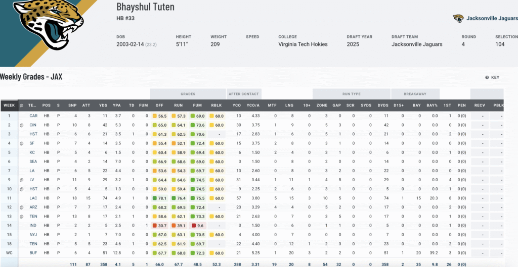 With Travis Etienne deporting, the Jaguars are left with second-year rushers LeQuint Allen and Bhayshul Tuten, who respectively ranked 13th and 17th in PFF rushing grade among 20 qualified rookie running backs. While former Commander Chris Rodriguez Jr. does offer potential with a career average of 3.59 yards after contact per attempt, he’s never rounded into a consistently good starter.