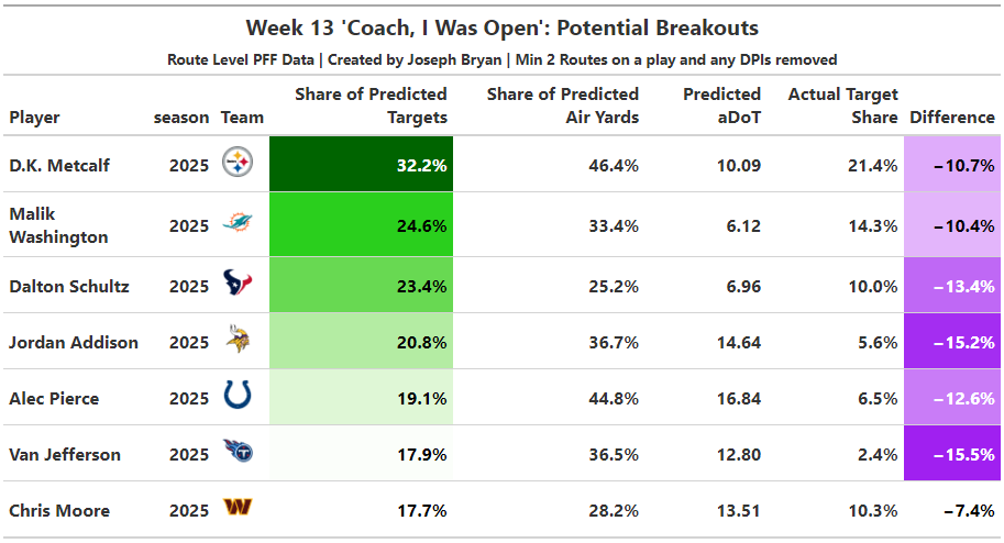 These are players who were open far more often than they were targeted in Week 12. In general, players who show up on this list see an uptick in targets per route run and target share relative to both themselves and all players with similar target shares.