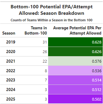 In 2025, the worst defense in potential EPA per attempt allowed, the Washington Commanders, ranks as the 50th-worst single-season defense since 2019. Only three defenses this season — Commanders, Titans and Giants — are in the bottom 100 since 2019. Moreover, the average potential EPA a defense is facing in 2025 is the lowest it has been in the dataset.