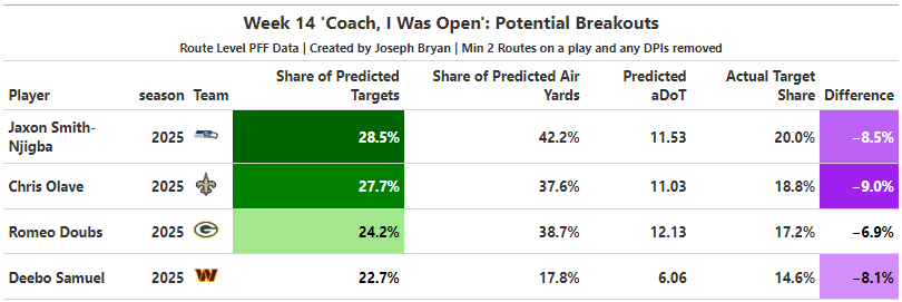 These are players who were open far more often than they were targeted in Week 13. In general, players who show up on this list see an uptick in targets per route run and target share relative to both themselves and all players with similar target shares.