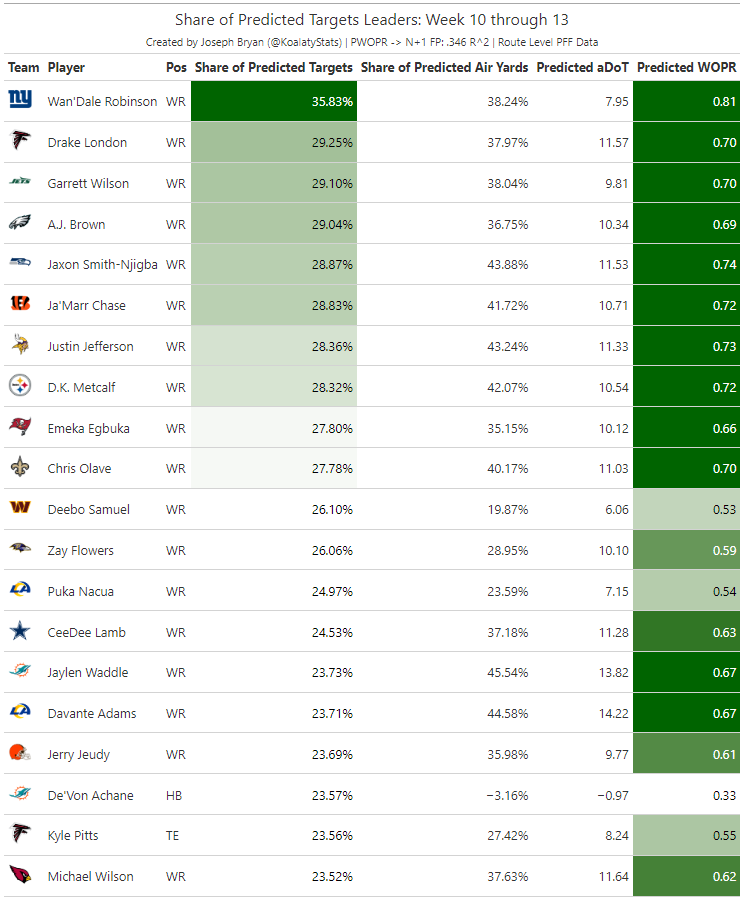 I wanted to take a moment to look at Weeks 10-13 and the leaders for the engine of the “Coach, I Was Open” model, share of predicted targets. As we have previously discussed, throwing to players that the Predicted Targets Model highlights creates better potential EPA outcomes for the entire offense. When the quarterback throws it to sub-optimal choices, the entire offense suffers, and we see far more negative EPA outcomes.