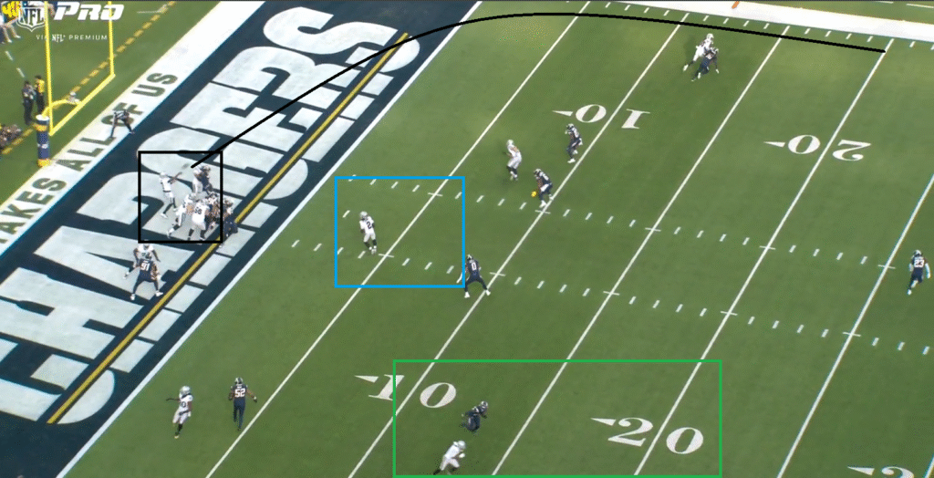 Dont’e Thornton Jr. failed to separate on a back-shoulder go, while Tre Tucker gained clear separation on a go route to the opposite side. On the play, Thornton was the only receiver charted with no separation of any kind and the lone player to earn a negative play-level PFF grade. Meanwhile, Tucker received a +1 play-level grade and posted a week-leading 2.31 predicted EPA.