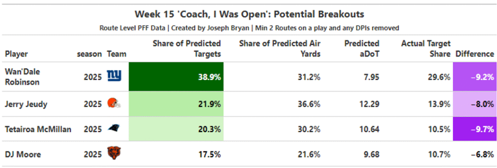 These are players who were open far more often than they were targeted in Week 14. In general, players who show up on this list see an uptick in targets per route run and target share relative to both themselves and all players with similar target shares.