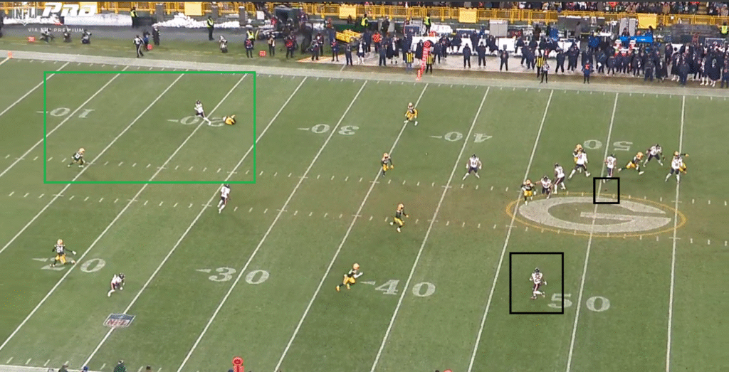 Caleb Williams began this play looking at Burden, but the moment he pivoted toward his checkdown, Kyle Monangai, is when Burden broke free. This missed play was not Williams' fault, as he was getting the ball out before pressure arrived. But, this is a moment that the Bears should see in film review and hopefully get Burden even more involved in the offense.
