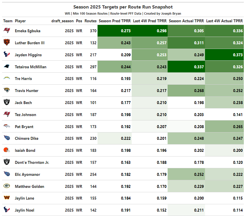 Emeka Egbuka leads the rookie class with both the best season-long predicted targets per route run (PTPRR) and the best last four weeks of PTPRR. His box score has certainly not indicated a successful last month of the season, but he is seventh in the NFL in targets and first in uncatchable targets.