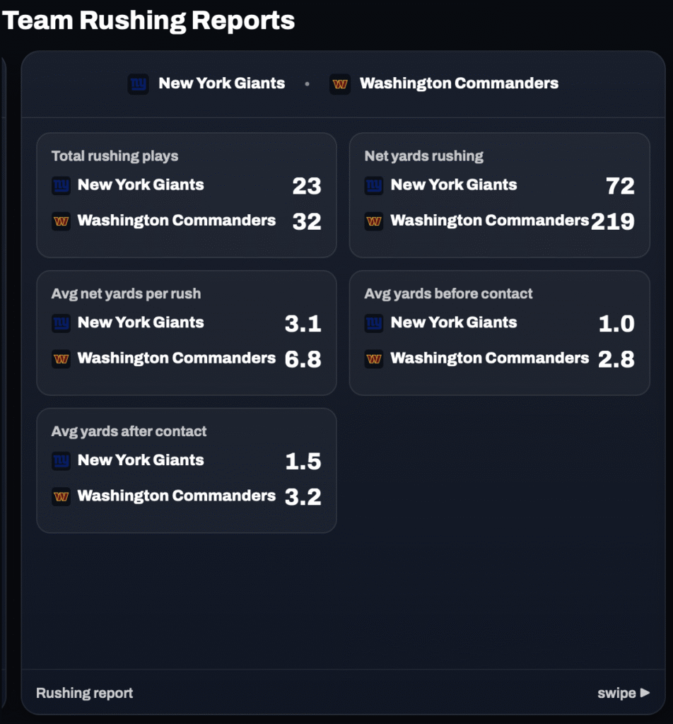 Why the Commanders won: The Commanders were comfortable in their season opener against the Giants, and were able to consistently create explosive plays in the run and pass games. The offense tallied 14 total explosive plays — eight rushing and six passing — for 262 yards, while rookie Bill Croskey-Merritt and Jayden Daniels both had three explosive rushes each as the Commanders earned 6.9 yards per attempt on the ground.