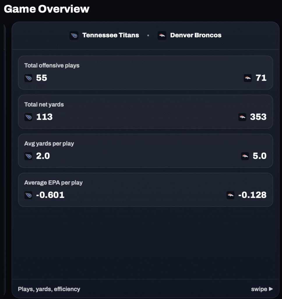 Why the Broncos won: The Broncos' defense was one of the best in the NFL in 2024, and the unit took little time to carry on from where it left off in Week 1. The pass rush exploded, sacking rookie quarterback Cam Ward six times while generating 28 total pressures. The team’s top rusher, Nik Bonitto, celebrated his new extension by securing a 91.6 PFF pass-rushing grade, accumulating six pressures and sacking Ward once.